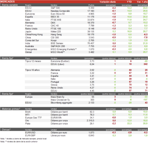 • Nueva sesión de pérdidas acusadas en las bolsas europeas ante la inestabilidad creada por la convocatoria de elecciones legislativas en Francia. Hoy ha destacado el retroceso del IBEX 35 de un 1,6% por el mal comportamiento de bancos y utilities, los dos sectores con más peso en el índice. El CAC 40 de París ha tenido un tono algo más sostenido después del retroceso de ayer cediendo un 1,3%, mientras el Euro Stoxx 50 ha cerrado con una caída de un 1%.