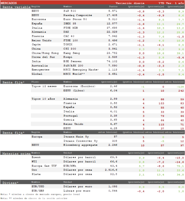 - Los principales índices europeos cerraron con descensos superiores al 1% por segunda sesión consecutiva contagiados por la corrección de la bolsa de EEUU, que se ha intensificado en los últimos días ante el temor a que la guerra arancelaria pueda deteriorar la economía a corto plazo. El intento de rebote matinal en Europa no ha cuajado y los índices se han girado a la baja tras la apertura de Wall Street, con los sectores de Viajes y Salud liderando los descensos. El IBEX 35 ha cedido un 1,6% marcando mínimos de tres semanas. Por su parte, el Euro Stoxx 50 ha cerrado con una caída de un 1,4%.