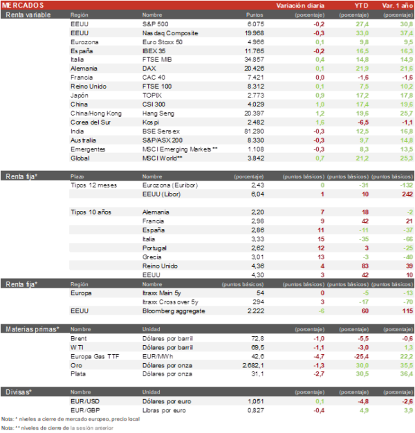 • Los principales índices europeos han registrado hoy una sesión mixta sin grandes cambios en las bolsas. La noticia del día ha sido la discusión entre los miembros europeos de la OTAN sobre el aumento del objetivo de gasto de defensa hasta el 3% del PIB.  El Euro Stoxx 50 ha registrado un ligero avance liderado ABI con una subida del 1,8% y de Airbus que sube un 2,3%. El IBEX 35 ha bajado un 0,23%, la caída ha sido liderada por Inditex que suma su segunda sesión en negativo tras bajar un 2,4%. El DAX alemán ha cerrado la sesión con una subida del 0,1%.