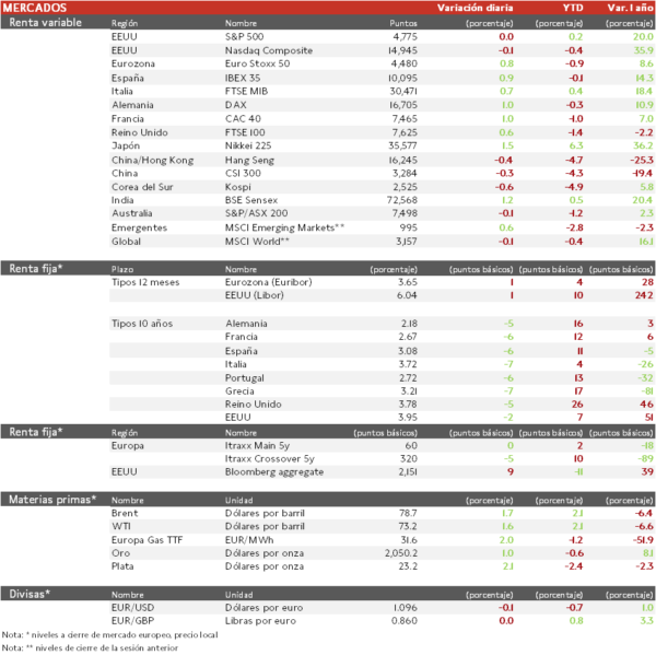 - Tras el dato de inflación de EEUU, hoy hemos conocido el IPC de China, que evidencia el limitado dinamismo de la economía asiática. En contraste, la lectura final de la tasa de inflación en España y Francia ha reforzado la esperada estabilización de los precios en Europa. En este sentido, la presidenta del BCE, Christine Lagarde, ha abierto la puerta a comenzar los recortes de tipos de interés, aunque sin plazos.