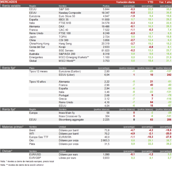 - Los principales índices europeos han registrado descensos de intensidad desigual después de que ASML rebajar su previsión de ingresos y márgenes para 2025. Entre los principales índices ha destacado la caída del CAC 40 francés de un 1,1% por los descensos en TotalEnergies y las compañías de lujo. Por su parte, el Euro Stoxx 50 ha perdido un 1,9% mientras el IBEX 35 ha repuntado un 0,7% por el buen comportamiento de las utilities y las compañías de infraestructuras.