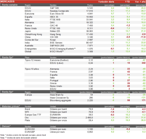 • La TIR del Bund a 10 años ha bajado 1 pb hasta 2,24% y la referencia española se sitúa en el 3,08%. Los mercados continúan descontando rápidos recortes de los tipos por los bancos centrales, que situarían a la Fed en el 3,50% y al BCE alrededor del 2,25% dentro de un año.