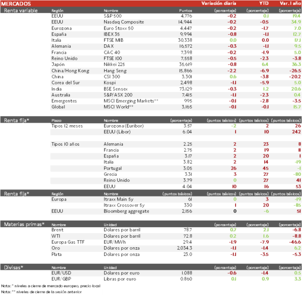 • La generalizada caída de las bolsas europeas ha estado nuevamente liderada por el IBEX 35. Los mayores retrocesos en el selectivo español, que ha perdido la cota de 10.000 puntos, los han registrado Solaria y Acciona Energía, valores muy sensibles a la evolución de los costes financiación. Asimismo, el sector bancario ha mostrado importantes pérdidas por la bajada de recomendación de Banco Sabadell. En Europa, ha destacado la pérdida de valoración bursátil de Hugo Boss tras la publicación de resultados, impulsando a la baja al conjunto del sector de consumo discrecional y, especialmente, los valores de lujo.