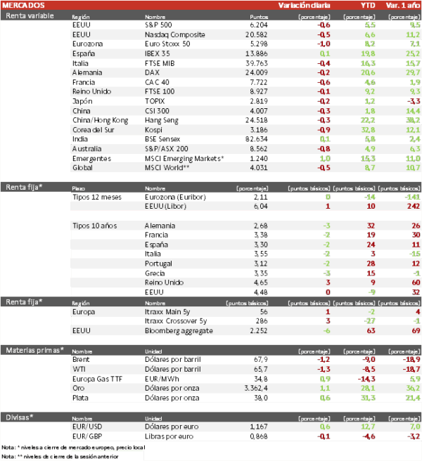 - Los principales índices europeos y estadounidenses borraron las subidas a última hora de sesión europea ante los rumores de que la Administración Trump pretende despedir pronto al presidente de la Reserva Federal, Jerome Powell. El IBEX 35 es el único de los principales índices en terminar en positivo con 0,1%, y el Euro Stoxx 50 acusa la mayor caída, 1,0%, afectado por la mala publicación de ASML.