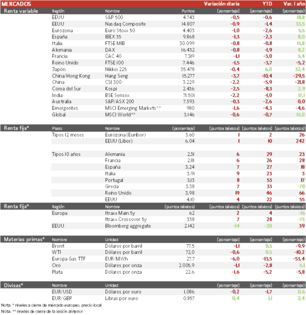• Todos los principales índices europeos han sufrido una salida de capitales al reducirse las expectativas de bajada de tipos de interés por parte de la Fed y del BoE. El IBEX 35 cierra con un retroceso de un 1,3%, y el Euro Stoxx 50 se ha dejado un 1,0%. Todos los sectores han terminado en negativo, destacando el inmobiliario, el de consumo discrecional y el eléctrico.