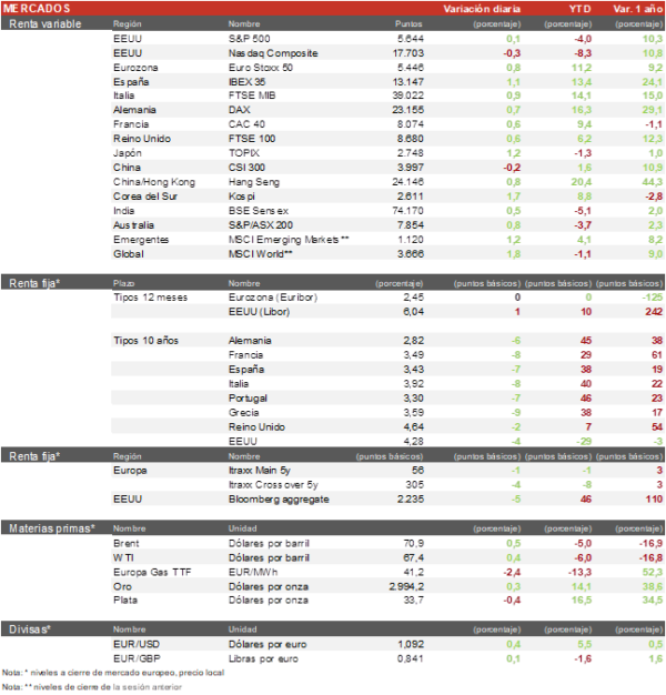 - Los principales índices europeos han tenido una sesión positiva. El IBEX 35 cierra con una ligera subida del 1,1% y el Euro Stoxx 50 un 0,8%, lastrado por el sector del lujo, pero favorecido por la industria y el sector bancario. En Alemania, el DAX ha subido un 0,7% y en Francia, el CAC 40 un 0,6%.