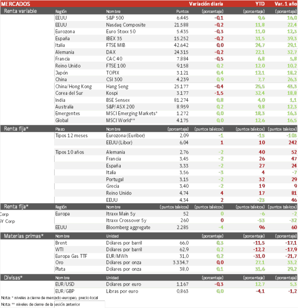 - Jornada de ligeras caídas en las TIRes de los principales bonos soberanos, con el mercado esperando que Jerome Powell envié una señal de que la Reserva Federal está a punto de reanudar la reducción de los tipos de interés.