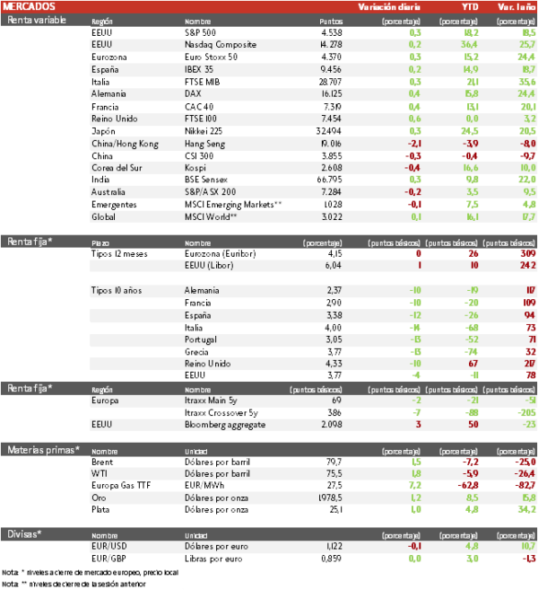 Jornada de ascensos en los principales índices mundiales a pesar de los recientes datos económicos por debajo de las expectativas en EEUU y ante la elevada probabilidad de que el BCE y la Fed opten por nuevas subidas de tipos de interés oficiales en sus reuniones de la próxima semana.