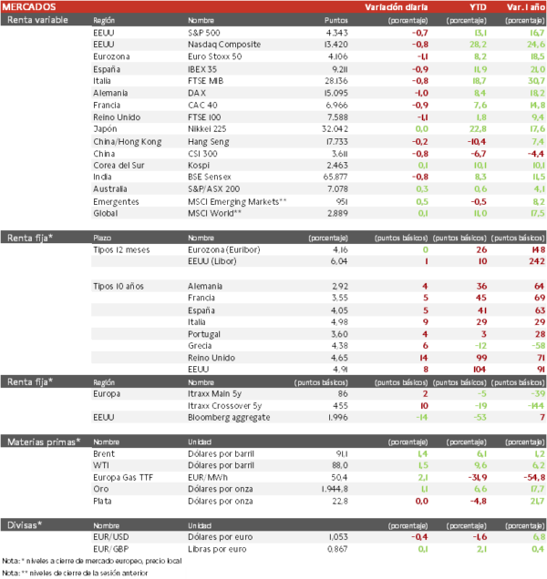 - En la región Asia-Pacífico, continuando con la tónica de aversión al riesgo por la guerra en gaza, el Hang Seng hongkonés ha registrado un descenso de 0,2%, y el Nikkei 225 japonés ha cerrado plano. El PIB de China en el 3T creció un 1,3% intertrimestral, por encima del 0,5% del 2T y del 1,0% proyectado por el consenso. En términos interanuales, superó las estimaciones del consenso (4,4%) al repuntar un 4,9% (vs. 6,5% en el trimestre anterior).
