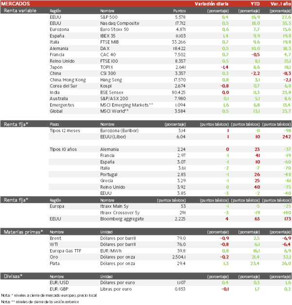 • Los principales índices europeos han comenzado la semana con subidas considerables, a la espera de señales sobre el alcance de los posibles recortes de los tipos de interés por parte de la Reserva Federal. El IBEX 35 es el índice que más sube en Europa con 1,4%, el DAX se queda rezagado con 0,5% y el Euro Stoxx 50 sube un 0,6%. Los sectores cíclicos han experimentado los mayores avances, destacando el de consumo discrecional y utilities.