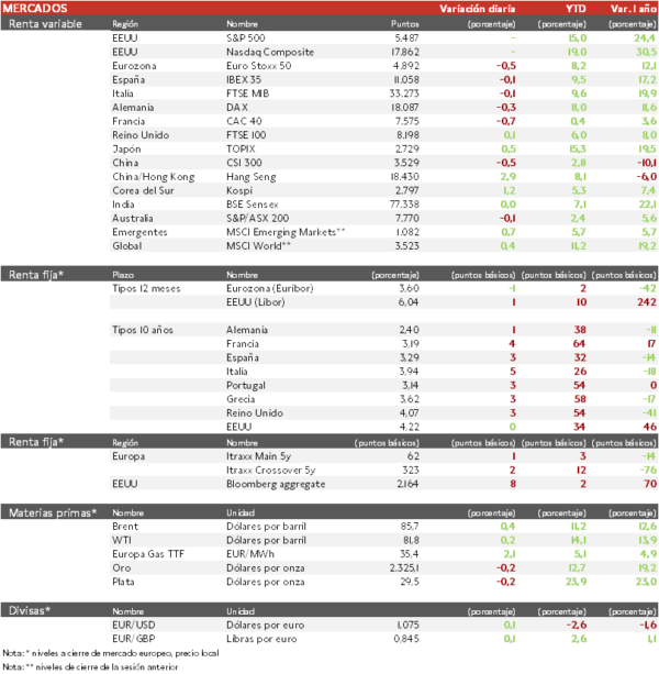 - En la región Asia-Pacífico, el Hang Seng hongkonés ha registrado la mayor revalorización (2,9%). La subida de Nvidia ha impulsado a los valores relacionados con los chips en Asia por el optimismo ante la IA. Por su parte, el Topix japonés ha limitado su repunte a un 0,4%, con la balanza comercial de mayo mostrando un crecimiento de las exportaciones de un 13,5% interanual y de las importaciones del 9,5%.