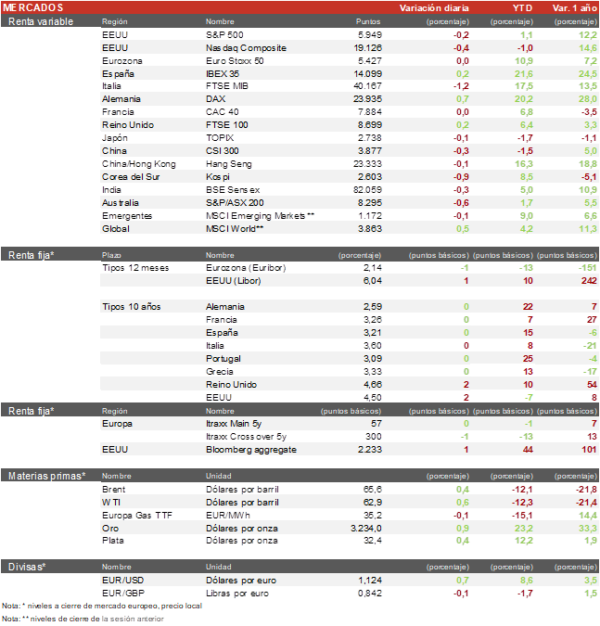 • Los principales índices europeos han tenido un comportamiento mixto en una sesión de consolidación con las subidas lideradas por el sector de defensa. Al cierre, el Euro Stoxx 50 y el CAC 40 han cerrado plano, mientras el DAX sube un 0,7% y el IBEX 35 amplía las subidas un 0,2%.