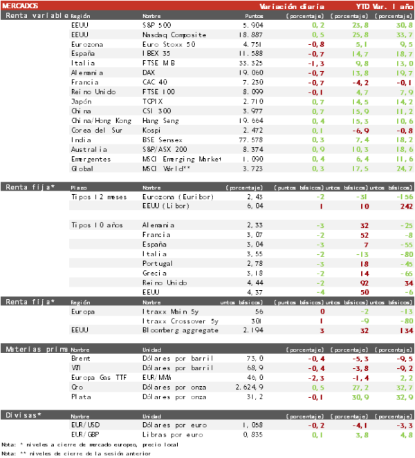 - En la región Asia-Pacífico la sesión ha sido alcista con los índices tratando de estabilizarse tras las caídas de los últimos días. Una vez que los mercados han puesto en precio un escenario de mayor inflación y los riesgos arancelarios, parece imponerse una pausa hasta conocer las medidas concretas de la nueva administración.