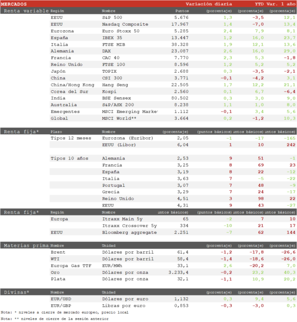 • La bolsa europea ha continuado con su racha de avances en una sesión marcada por el optimismo sobre las negociaciones comerciales y la inercia de la subida de ayer en Wall Street tras los buenos resultados publicados por Meta y Microsoft, que han contribuido a relajar los temores a un frenazo en la IA. Los principales índices europeos han vuelto a los niveles del 2 de abril el día del anuncio de la subida de aranceles que provocó el gran desplome del mercado.
