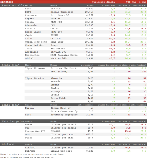 - En la lectura final de diciembre de la confianza del consumidor de la Universidad de Michigan en EEUU repuntó hasta 74,0 puntos (vs. 71,8 puntos en noviembre). Por su parte, las expectativas de inflación media en los próximos 5 años se moderaron 0,2pp hasta un 3,0%, por debajo de lo estimado por el consenso de analistas (3,1%). Adicionalmente, el índice de expectativas se sitúo en 73,3 puntos (vs. 76,9 puntos el mes pasado), y el índice de condiciones en 75,1 puntos (vs. 63,9 puntos en noviembre). Todo ello en un contexto en el que Donald Trump tomará posesión el próximo 20 de enero.