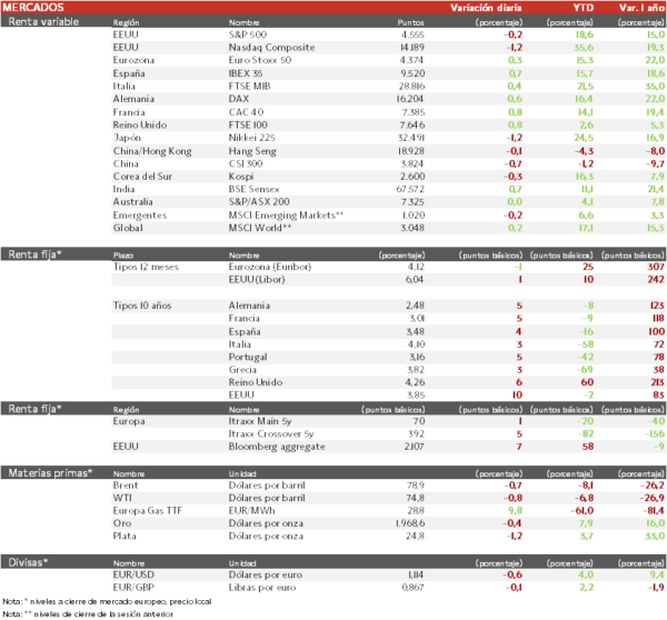 En este contexto, el Eurostoxx 50 ha subido un 0,3%. En España, el IBEX 35 se mantiene por encima de 9.500 puntos y los índices estadounidenses registran avances de alrededor de un 0,5%.
