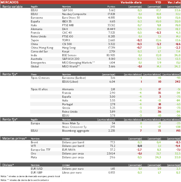 - Los principales índices europeos han continuado con la recuperación del final de la sesión ayer en EEUU. El IBEX 35 cierra con una subida del 0,2%, el FTSE MIB es el índice que más sube en Europa con un 0,7% y el Euro Stoxx 50 ha avanzado un 0,6%.