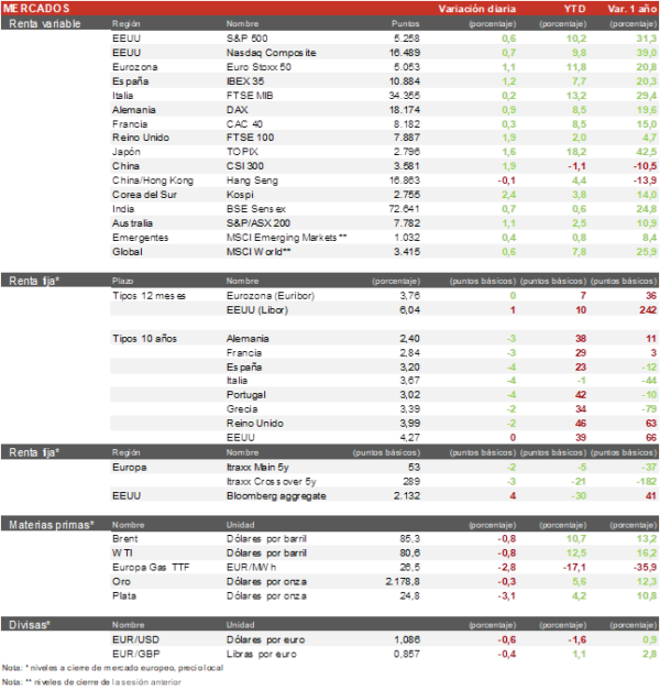 - En su reunión de ayer la Fed transmitió unas expectativas optimistas sobre la evolución de la economía y la inflación en 2024-25, a la vez que mantuvo la proyección de rebajar en 75 pb las tasas oficiales. La confirmación de ese escenario ha provocado revalorizaciones importantes en aquellas empresas con costes de financiación mayores. La nota más positiva la ha puesto de nuevo Grifols con otra sesión subiendo más de un 4%. Otras compañías con alto endeudamiento como Cellnex, Merlín o Colonial se anotan subidas importantes.