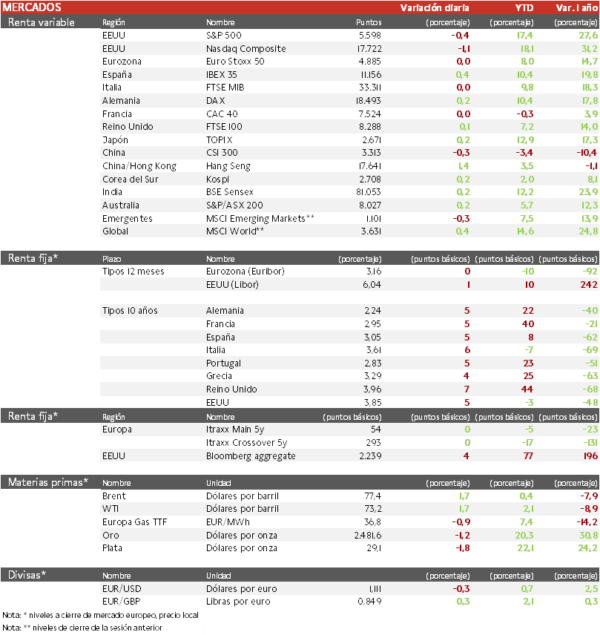 - En la región Asia-Pacífico, el Hang Seng hongkonés ha registrado la mayor revalorización (1,4%), destacando el avance de Xiaomi de un 9% al haber aumentado un 20% su beneficio neto en el segundo trimestre de 2024. Paralelamente, el Topix japonés ha limitado su repunte a un 0,3%. El Gobernador del Banco de Japón, Kazuo Ueda, mañana compadece ante los legisladores, después de la línea dura que llevó la Entidad a elevar sus tipos a principios de mes.