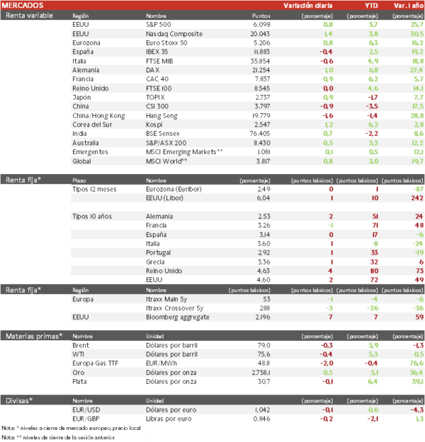 • En España, Pedro Sánchez ha apostado por un acercamiento constructivo a Donald Trump y ha pedido relaciones equilibradas con China. Por otro lado, los inversores temen las medidas que pretende tomar para hacer frente a la creciente crisis de la vivienda en España, incluida la prohibición de que personas de fuera de la UE compren viviendas en el país sin ocuparlas.