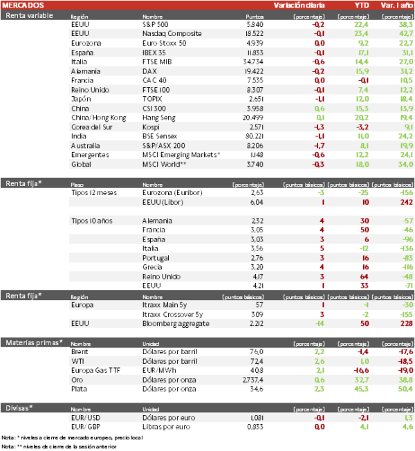 • Los principales índices europeos han logrado limitar las pérdidas al cierre, en una sesión marcada por las tomas de beneficios en los sectores más sensibles a la rentabilidad de los bonos como utilities, telecos e inmobiliarias. Por su parte, el sector tecnológico ha destacado en el Stoxx 600 con un repunte superior al 1% tras los sólidos resultados del fabricante de software alemán SAP. Los recientes comentarios de miembros de la Fed apuntando a una senda de rebajas de tipos cautelosa, se han unido a una publicación de resultados en Europa algo por debajo de las previsiones. Pese a ello, los índices europeos se mantienen consolidando cerca de sus máximos anuales con una presión bajista limitada.