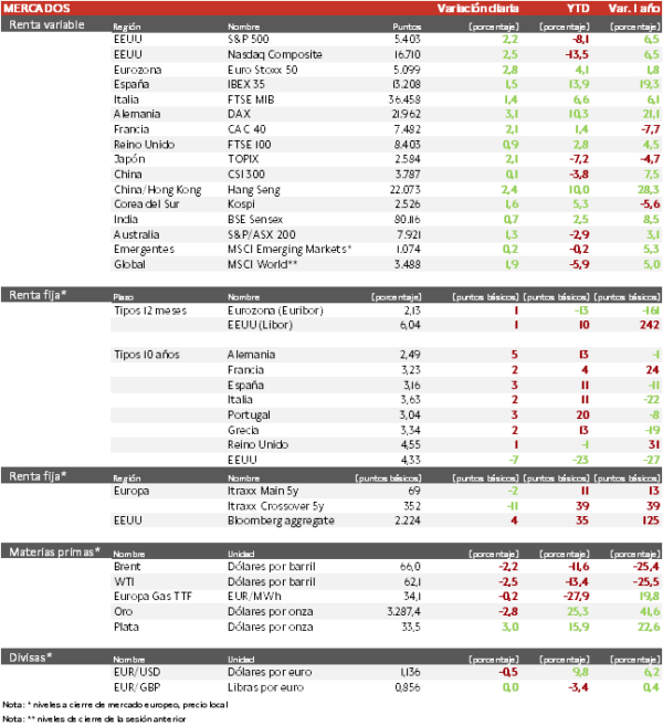 - Las acciones globales han subido al ponderar que Donald Trump reducirá su agresividad arancelaria, después de que la Casa Blanca adoptara un tono más suave sobre el comercio y la independencia de la Reserva Federal.