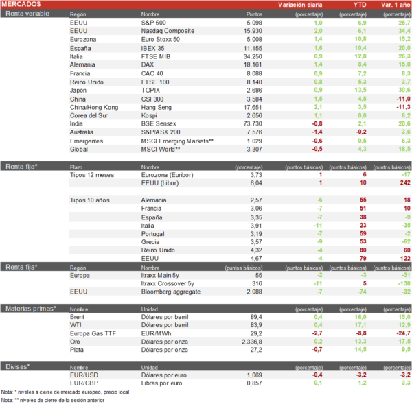 • En EEUU, la temporada de resultados sigue al rojo vivo, esta vez luces y sombras en el sector tecnológico, Microsoft y Alphabet presentaron buenos resultados batiendo estimaciones, pero el lado negativo lo ha puesto Intel que cae un 10% tras unos resultados flojos y donde la empresa no espera crecimientos en el area de productos para centros de datos y fabricación hasta la segunda mitad del año. Al cierre europeo los índices suben con fuerza, el S&P 500 sube un 1%, el Nasdaq un 2% y el Russell 2000 un 0,8%.