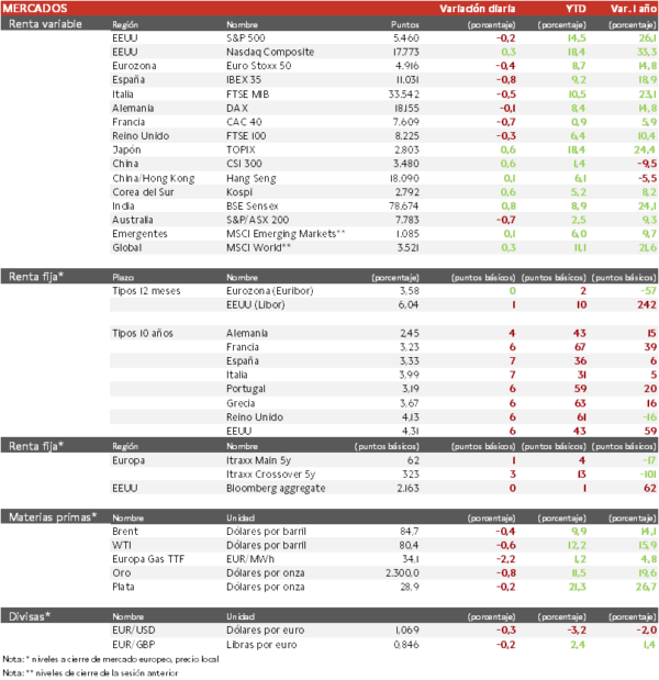 • Jornada de subidas en las TIRes de los principales bonos soberanos, en un contexto en el que la probabilidad de que la Fed realice un recorte de tipos de 25 pb en septiembre se mantiene en el 70%. El Gobernador del Banco de Finlandia, Olli Rehn, ha comentado que sería razonable realizar dos recortes más este año, y llevar el coste de los préstamos en la Eurozona hasta el 2,25% en 2025, en línea con lo esperado por el mercado (recortes de 25 pb en octubre y diciembre, terminando el año en el 3,25%). Sin embargo, en EEUU la gobernadora de la Reserva Federal, Michelle Bowman, ha reiterado su opinión de que los tipos deberían permanecer elevados durante algún tiempo.