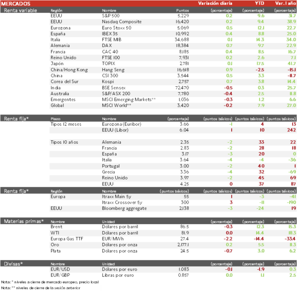 • La semana continúa con pocas referencias macroeconómicas y empresariales en Europa. En el comienzo de la sesión la atención de los inversores se ha centrado en la publicación del índice GfK de Alemania, que confirma la ligera recuperación de la confianza de los consumidores que, no obstante, continúa en niveles históricamente deprimidos. Por su parte, en España se ha confirmado el crecimiento del PIB en el 4T de 2023 de un 0,6% intertrimestral y un 2,5% en el conjunto del año.