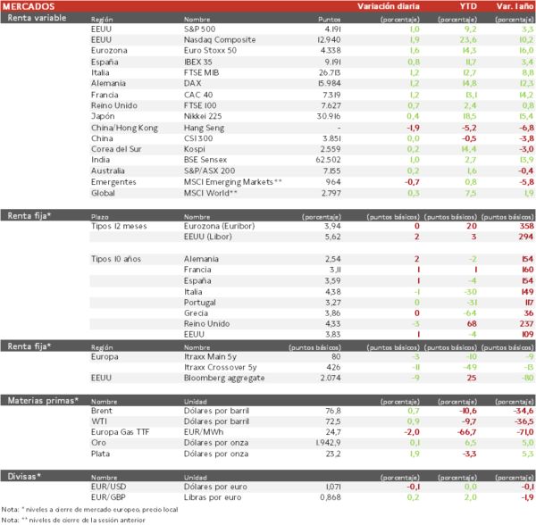 Con todo, el Eurostoxx 50 ha subido un 1,6%, mientras el IBEX 35 se acerca a la barrera de 9.200 puntos. Por su parte, los índices estadounidenses registran avances superiores a un 1%.