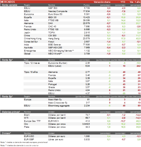 - Jornada con escasos cambios en la renta fija, tan solo destacamos la fuerte venta de bonos británicos (Gilts) que ha provocado un aumento del rendimiento de bono a diez años del 4,7% hasta el 4,84%.