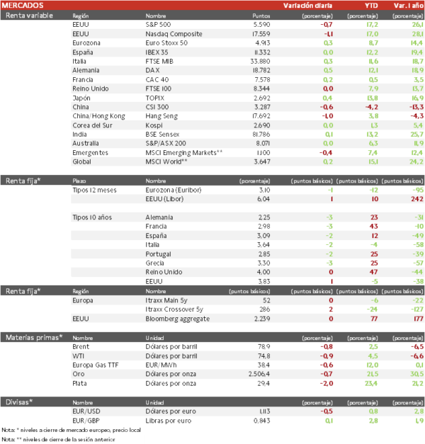 - Jornada de ligeras caídas en las TIRes de los principales bonos soberanos, mientras el mercado sigue descontando cuatro recortes de 25 pb para la Fed en lo que queda de año y dos para el BCE. A ambas Entidades le quedan tres reuniones por celebrar.