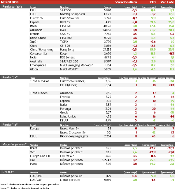 - Los principales índices europeos han estado hoy marcados de nuevo por la preocupación por la economía estadounidense, la incertidumbre sobre los aranceles y la situación fiscal del país. El IBEX 35 vuelve a destacar entre las rentabilidades europeas, esta vez hacia el lado negativo, con una caída de un 1,0%, y el Euro Stoxx 50 se ha dejado un 0,7%.