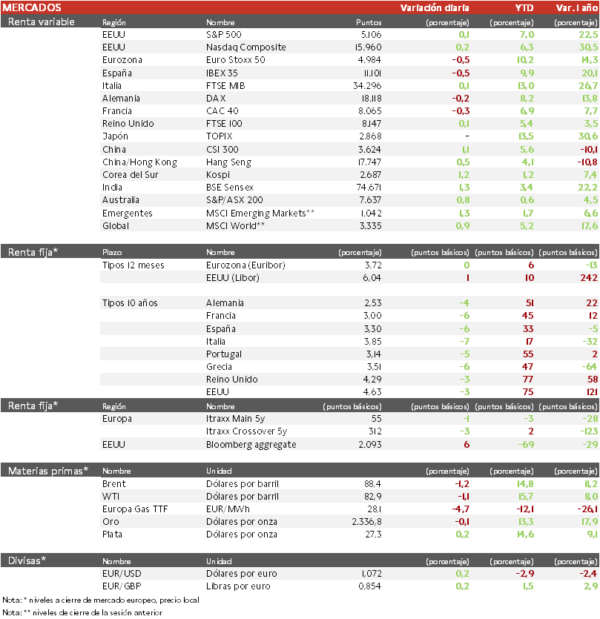 - En la región Asia-Pacífico, se ha apreciado el yen por la posible intervención de las autoridades tras haber caído por debajo de 160 yenes por dólar por primera vez desde 1990. En China, las acciones siguen con su rebote iniciado a mitad de abril. Así, el Hang Seng hongkonés ha registrado una revalorización de un 0,5% y el CSI 300 de un 1,1%. Paralelamente, el KOSPI surcoreano ha repuntado un 1,2%.