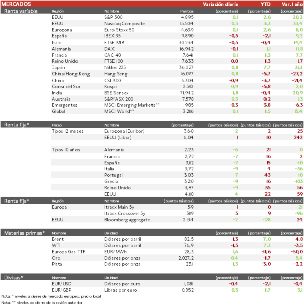 - Finalmente, la entrada de pedidos comparables ha sido de -3% interanual, aunque espera crecimiento en 2024. Para el año espera que las ventas comparables crezcan 4% (tras 6% en 2023) y el margen Ebitda un 11,25%.