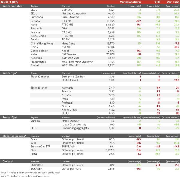• En una sesión con pocas referencias macroeconómicas en Europa, la atención de los inversores se ha centrado en el informe mensual de empleo de EEUU. El mercado laboral estadounidense continúa mostrando señales de enfriamiento, creciendo la contratación menos de lo esperado (+138 mil vs. 238 mil) y repuntando la tasa de desempleo a un 3,9% (vs. 3,8% en marzo). El incremento de los salarios ha sido menor al mes anterior (3,9% interanual vs. 4,1% en marzo). Paralelamente, el PMI del sector servicios de EEUU ha mostrado una moderación de la actividad al caer 0,4 puntos hasta 51,3 puntos.