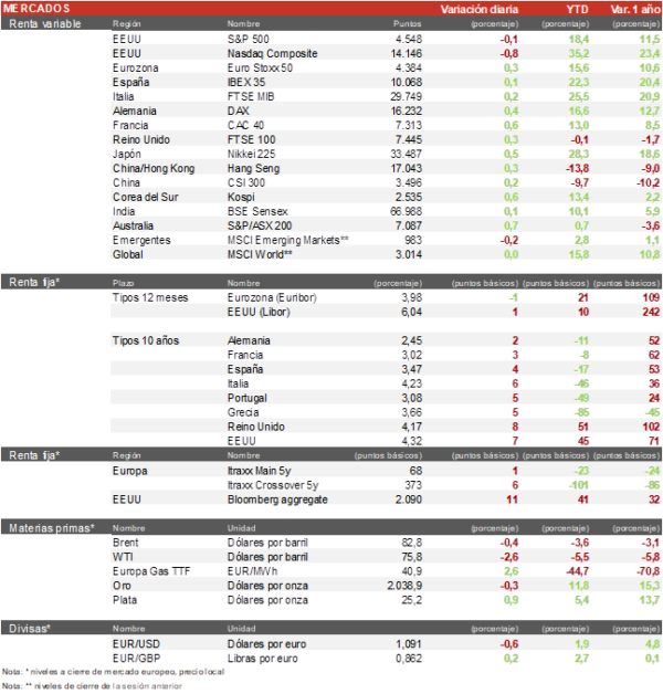 • Los índices europeos han registrado un tono alcista en general tras la mejora de la inflación en Europa con subidas en los principales índices: el DAX (+0,40%), el CAC 40 (+0,62%) y el FTSE 100 (+0,28%), siendo el IBEX 35 el más rezagado cerrando plano.