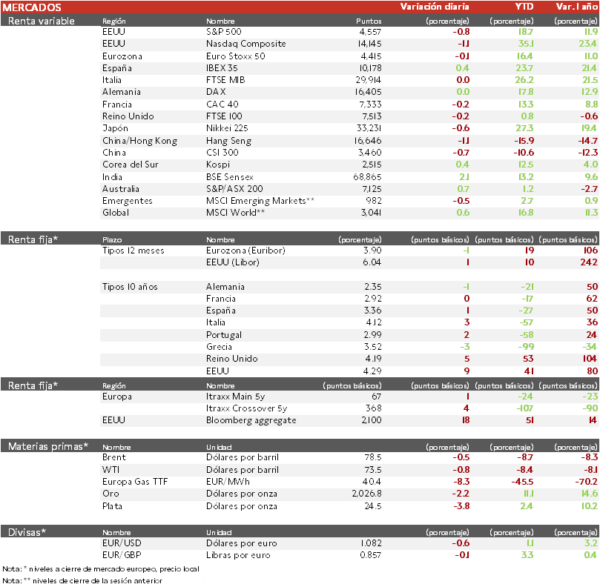 - El IBEX 35 ha consolidado los máximos desde 2018 tras cinco semanas consecutivas de avances. Por sectores, las compañías asociadas al petróleo acusan la caída del crudo, mientras que el sector renovable y las empresas endeudadas y más sensibles a los tipos de interés muestran los mayores avances.