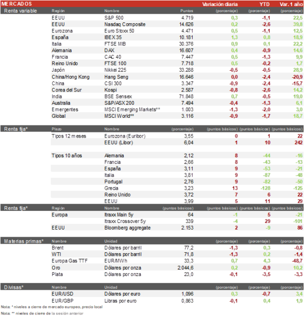 - Las TIRes de los bonos soberanos de la Eurozona y EEUU han repuntado cerca de 10 puntos básicos tras la publicación del acta de la reunión de diciembre de la Reserva Federal, y de declaraciones de algunos de sus miembros alejando la posibilidad de recortes de tipos ya en marzo. La rentabilidad del bono alemán a 10 años se sitúa en el 2,10% y la del bono español al mismo plazo en el 3,09%.
