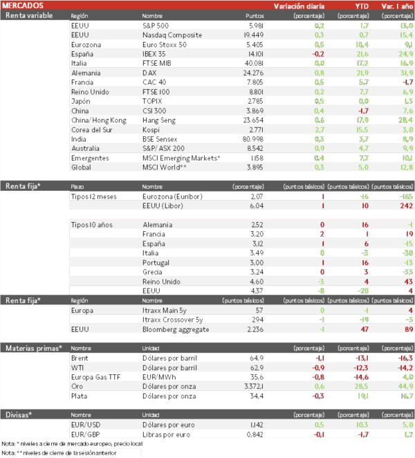 - Los principales índices europeos han subido con los inversores esperando que surjan acuerdos arancelarios bilaterales en EEUU, los indicios de resistencia económica y demanda tecnológica en el país, y ante las expectativas de que los tipos de interés bajen en Europa. El IBEX 35 se desmarca con una caída del 0,2%, el DAX vuelve a ser el índice que más sube en Europa con 0,8% y el Euro Stoxx 50 avanza un 0,5%.