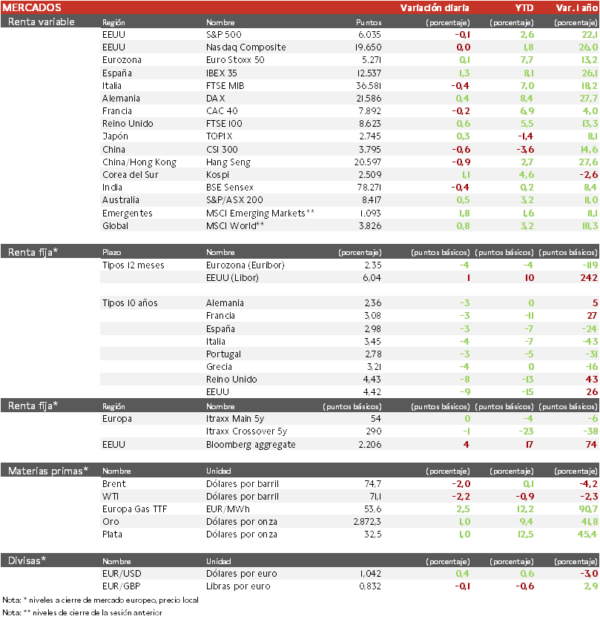 - A su vez, el oro ha subido un 1,0% hasta los 2.872 dólares, su máximo histórico.