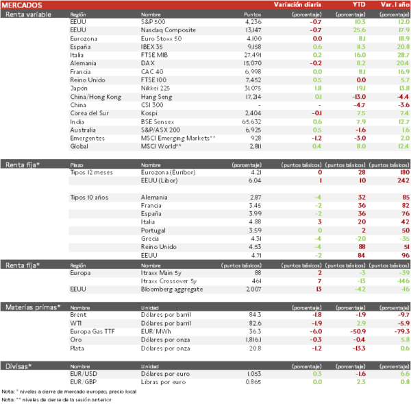 Nueva jornada de caídas de las TIRes de los bonos de la Eurozona. Tras las declaraciones de diversos miembros del BCE y la Fed a comienzos de semana señalando la posibilidad de nuevas alzas de tipos antes de 2024, en la sesión de hoy han predominado las compras. Se mantiene, no obstante, la preocupación en el mercado a la espera de nuevas referencias macroeconómicas y empresariales que esclarezcan la senda de la política monetaria de las principales entidades monetarias.