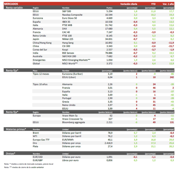 - Al cierre de la sesión europea el S&P 500 sube un 1,7%, el Nasdaq un 2% y el Russell 2000 un 1,5%.
