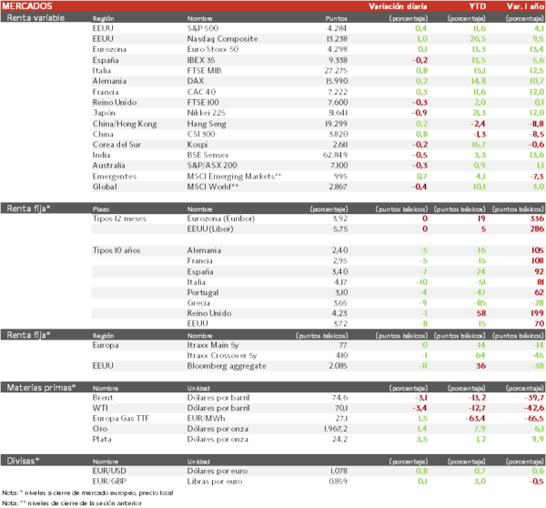 Jornada de ascensos en los principales índices europeos y estadounidenses, en una coyuntura en el que los datos de contabilidad nacional han reflejado que la moderación de los precios de la energía y la reapertura de China no han evitado que la Eurozona registrara una recesión técnica en el 1T de este año. La paulatina alineación del mercado con los mensajes de los banqueros centrales en las economías avanzadas (excluyendo Japón) sobre los riesgos que se mantienen entorno a la inflación general y subyacente, están moderando progresivamente el apetito por los activos de riesgo al proyectarse un escenario de tipos de interés oficiales elevados durante un periodo de tiempo más prolongado de lo esperado inicialmente por los inversores.