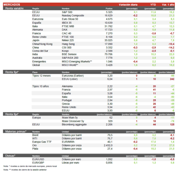 - En España, la jornada fue positiva con subidas en Cellnex (+2,75%), Inditex y el sector financiero. Las principales bajadas se han producido en el sector de utilities y energías renovables. En el lado empresarial destacamos la venta de Cellnex de su filial en Austria, la compañía continúa su proceso de desapalancamiento y lo hace saliendo de Austria, un país en el que estaba presente desde 2021, y cuya desinversión le proporcionará 803 millones de euros.