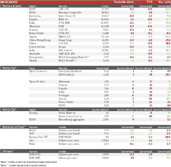 - En España, la atención se ha centrado en la farmacéutica Grifols, cuya valoración bursátil ha llegado a caer más de un 40% a raíz del informe de Gotham City Research. Paralelamente, el sector financiero continúa acusando la incertidumbre respecto a la política monetaria del BCE, cotizando en negativo todas las entidades financieras del selectivo. En contraste, Aena ha registrado los mayores avances tras incrementar diversos analistas su potencial en 2024 por encima del 20%.