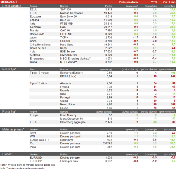 • En este contexto, la TIR del Bund a 10 años repunta 4 pb al 2,54% y la referencia española 2 pb a 3,22%. Por su parte, la TIR del Treasury a 10 años se sitúa en el 4,66%.