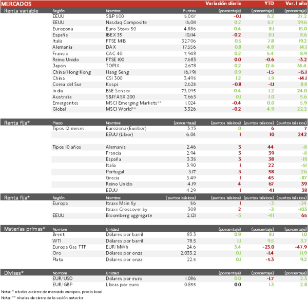 - Cautela en los mercados de materias primas en una sesión en la que los inversores ponderan la posibilidad de un acuerdo de alto el fuego en Gaza de 42 días (coincidiendo con el Ramadán). Una tregua que reduciría los riesgos en la ruta del mar Rojo y que, junto a la menor demanda esperada de crudo ante la proyección de que la Fed mantenga los tipos de interés elevados durante un prolongado período de tiempo, han contribuido a estabilizar el precio del petróleo en la jornada de hoy.