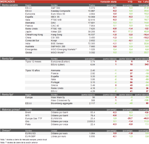 - En esta coyuntura, la TIR del Bund a 10 años ha caído 1 pb y se sitúa en 2,45%, la rentabilidad de la referencia española ha recortado 2 pb hasta un 3,33%. Por su parte, la yield del Treasury de EEUU a 10 años ha caído 2 pb y se sitúa en 4,29%.