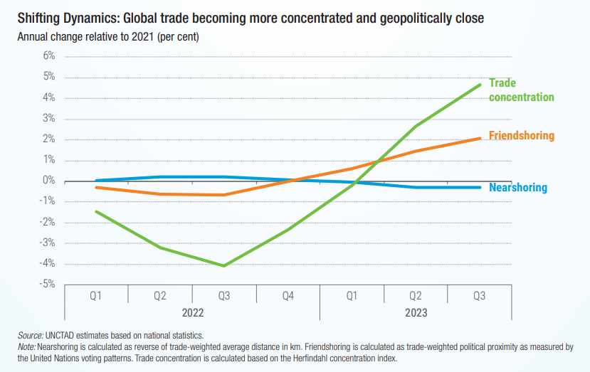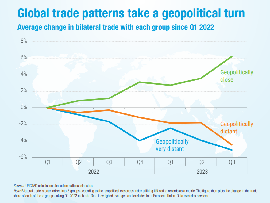 Países alineados políticamente están incrementando sus relaciones comerciales, lo que fomenta la resiliencia de sus economías. Este enfoque también refleja un cambio hacia la construcción de cadenas de suministro más seguras y menos vulnerables a las interrupciones causadas por el incremento de la conflictividad global.